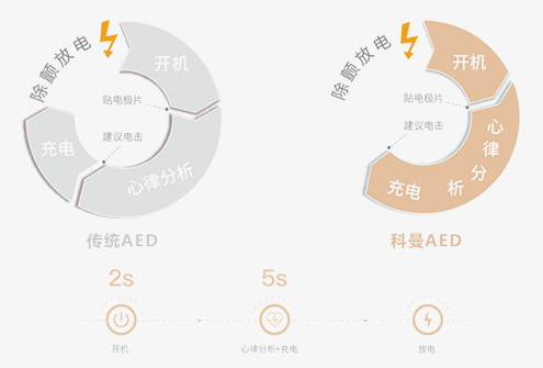 當(dāng)患者出現(xiàn)心臟驟停時(shí),黃金搶救時(shí)間只有4分鐘,分秒必爭(zhēng)??坡麬ED在心律分析過程中同步智能預(yù)充電縮短了開機(jī)和心律分析的時(shí)間,開機(jī)到充電完成全程不超過7秒,心律分析完成時(shí)即刻可以進(jìn)行放電。