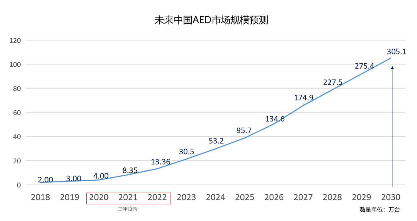 參照日本的發(fā)展速率推測,2018-2025年,中國的AED市場銷量將急劇上升,2026年后趨于平緩,每10萬人AED數(shù)量將接近200臺,未來中國的十萬人布防量按照人口14億來看。整個市場保有量將突破300萬臺,市場規(guī)模將突破800億RMB!